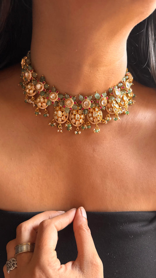 Real moissanite peeli polki with mint strawberry drops choker necklace