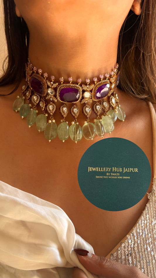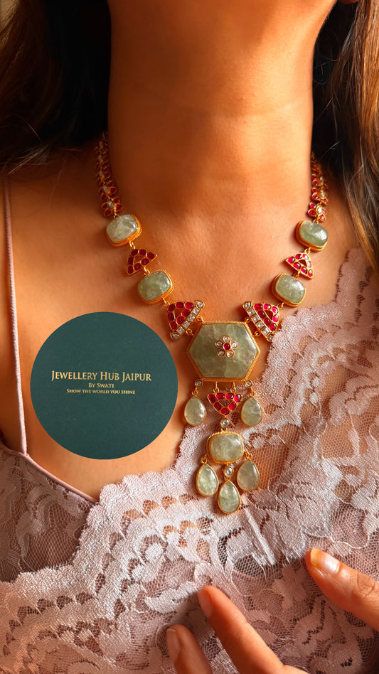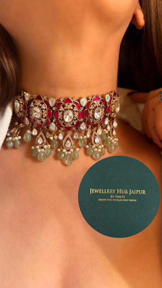 Amrapali inspired Natural stone Mint real & rani pink moissanite dual layer collar set