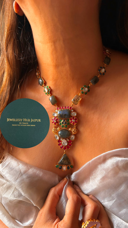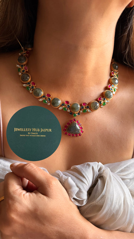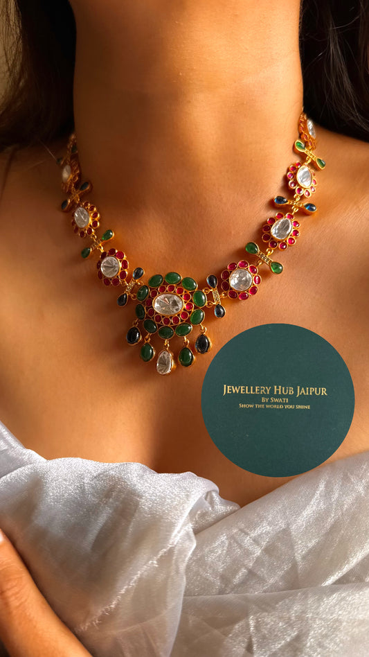 Amrapali inspired Natural stone Rani pink, sapphire and emerald with real stone collar set
