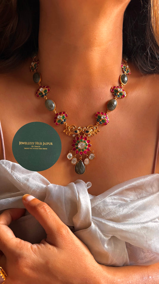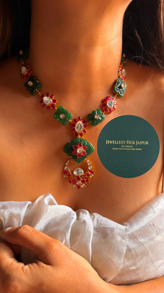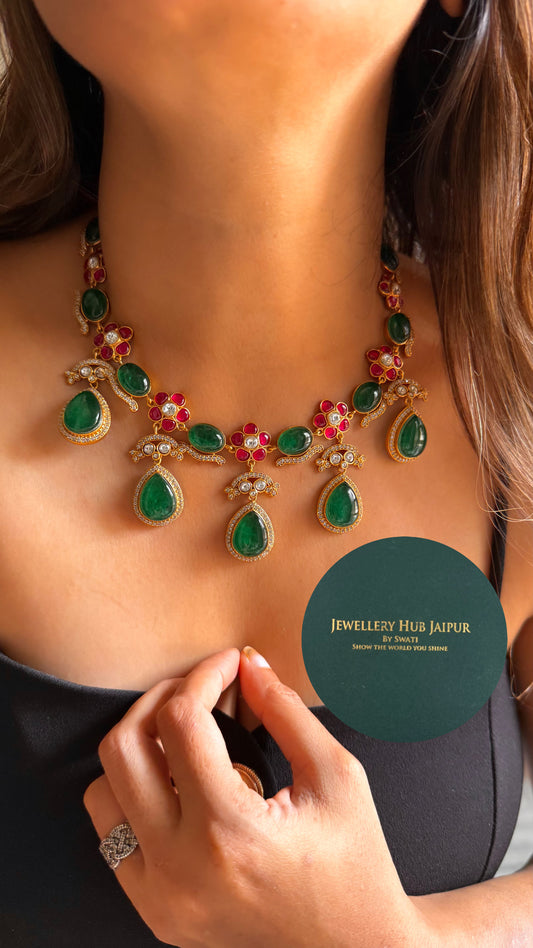 Amrapali inspired Natural stone Emerald doublet & rani pink floral moissanite collar set