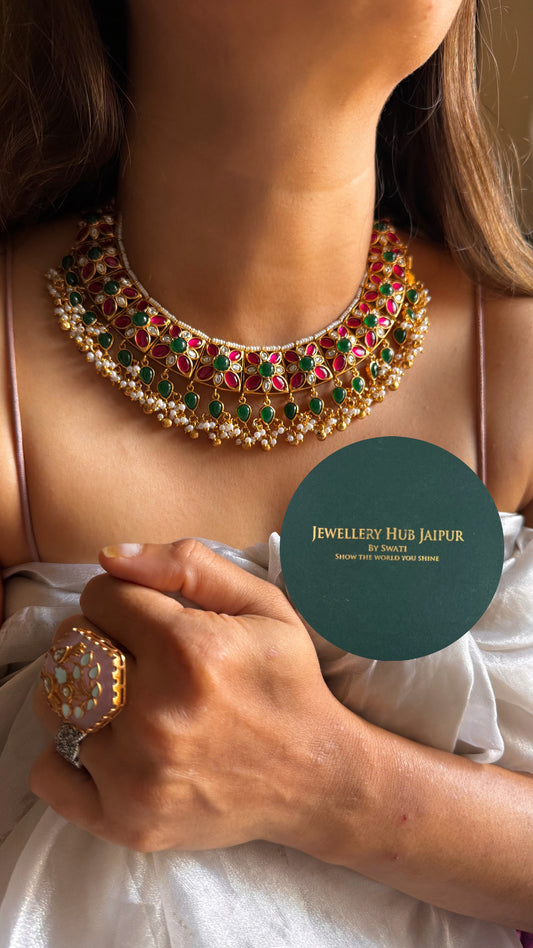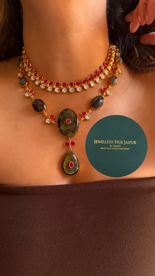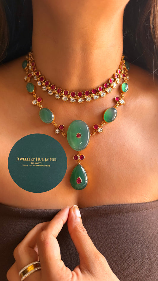 Amrapali inspired Natural stone Emerald & rani pink moissanite dual layer collar set