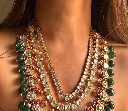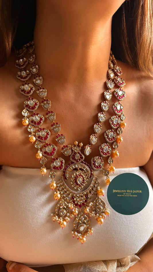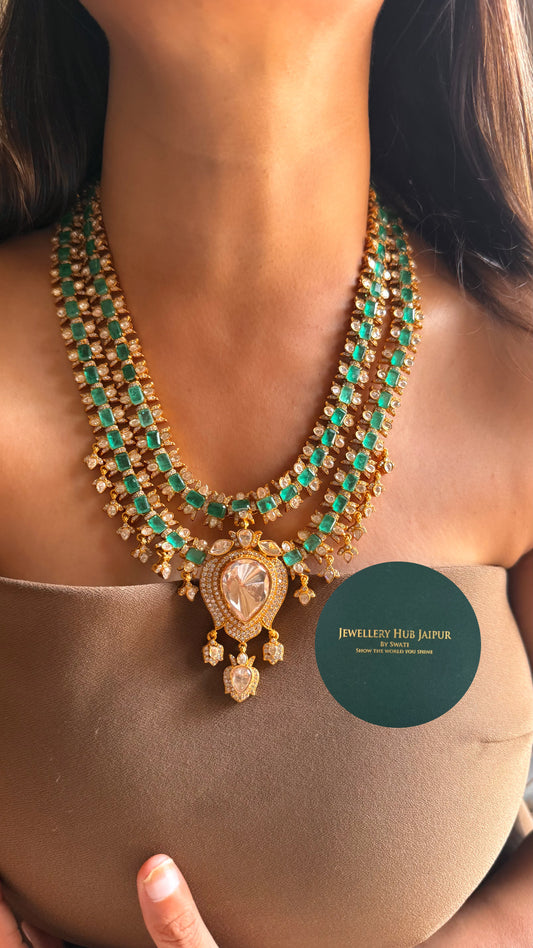 Ritu Raj Rani pink moissanite polki with emerald drop maharani haar