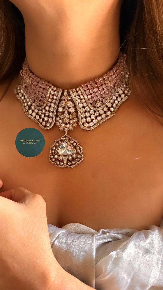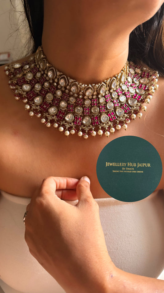Vintage Heritage Rani pink moissanite uncut polki Victorian pearl drop choker set