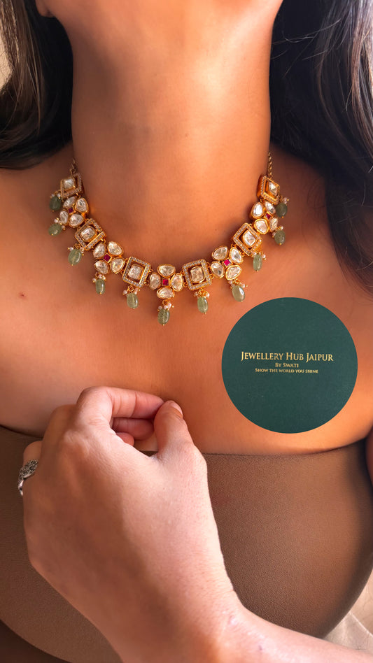 Rose quartz & mint Moissanite polki choker
