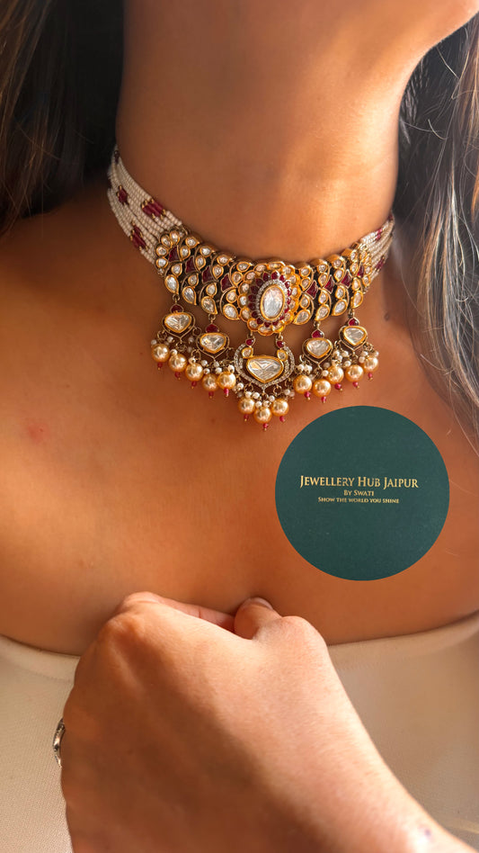 Vintage Heritage Rani pink moissanite polki with pearl drop rajwada choker set