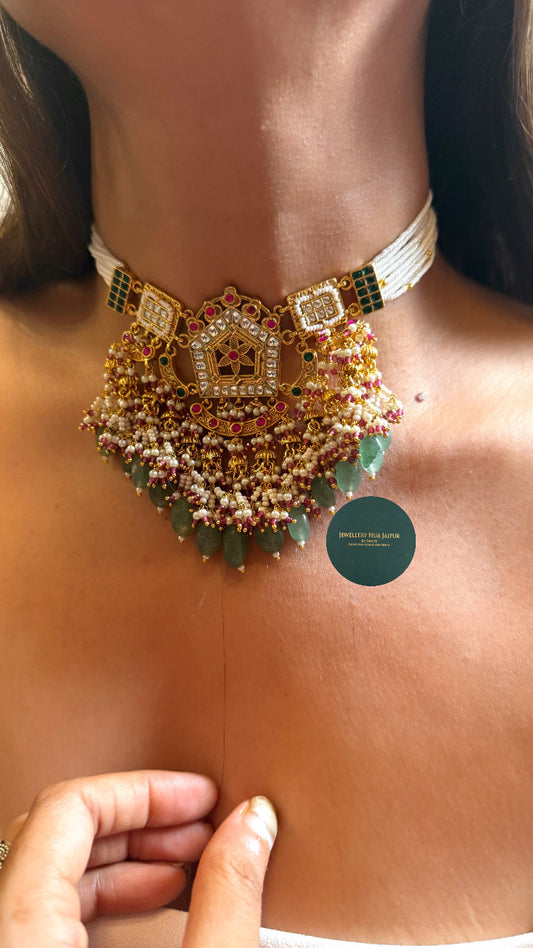 Heritage Rani pink & emerald moissanite with pearl drop rajwada choker set