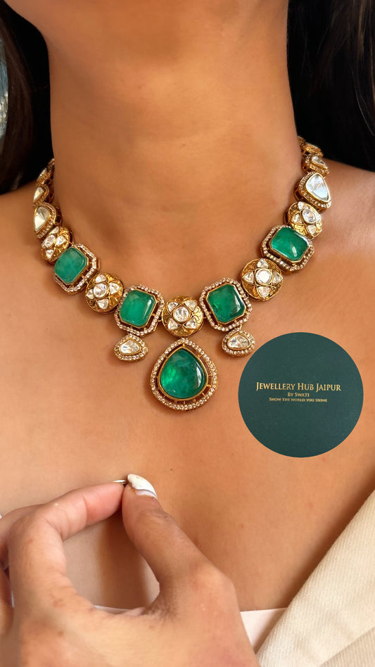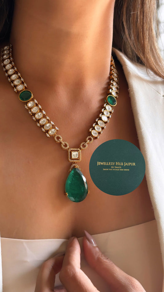Emerald meenakari drop shape polki necklace