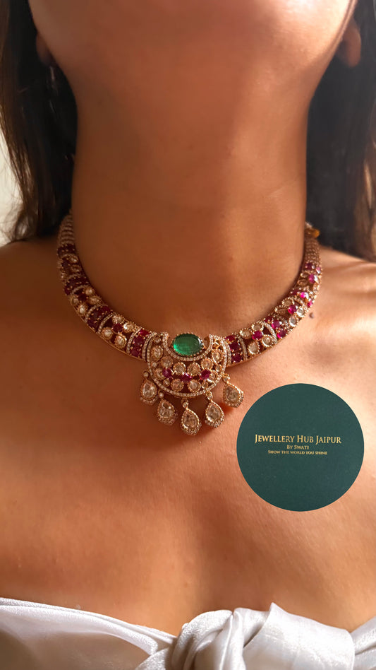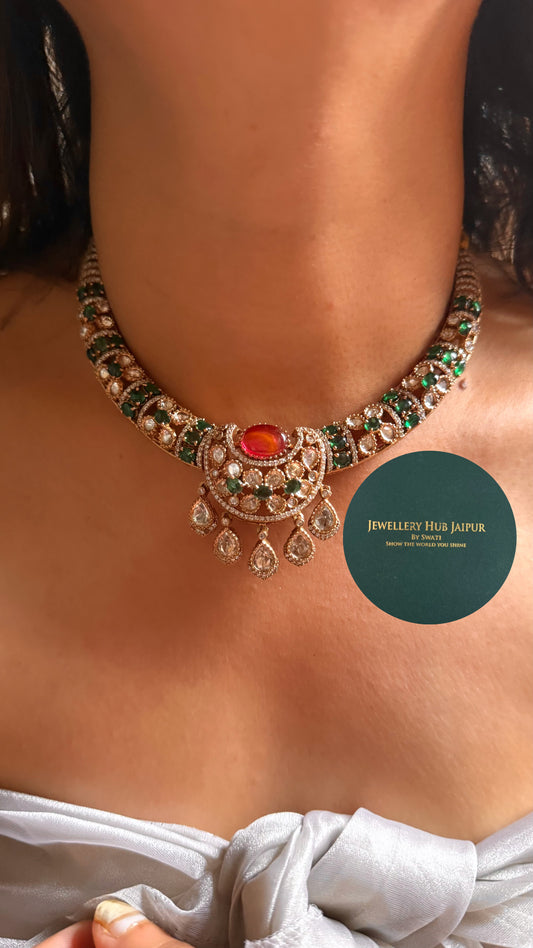 Real moissanite rani pink & emerald floral with mint drop collar set