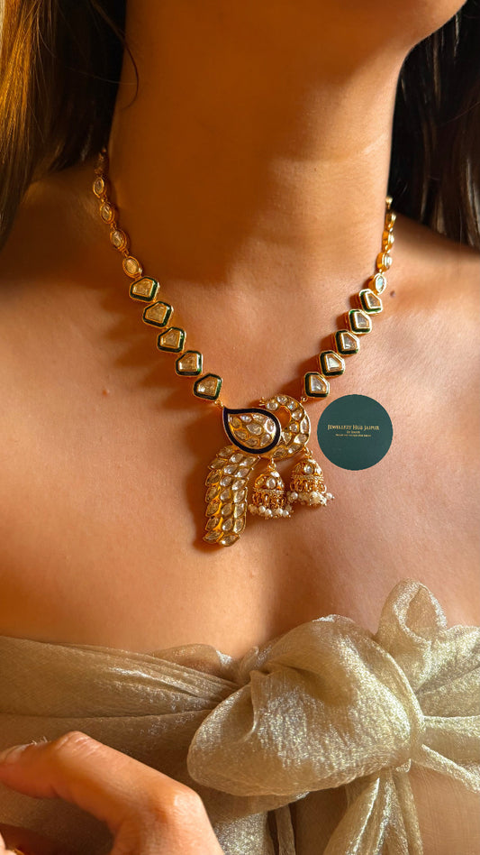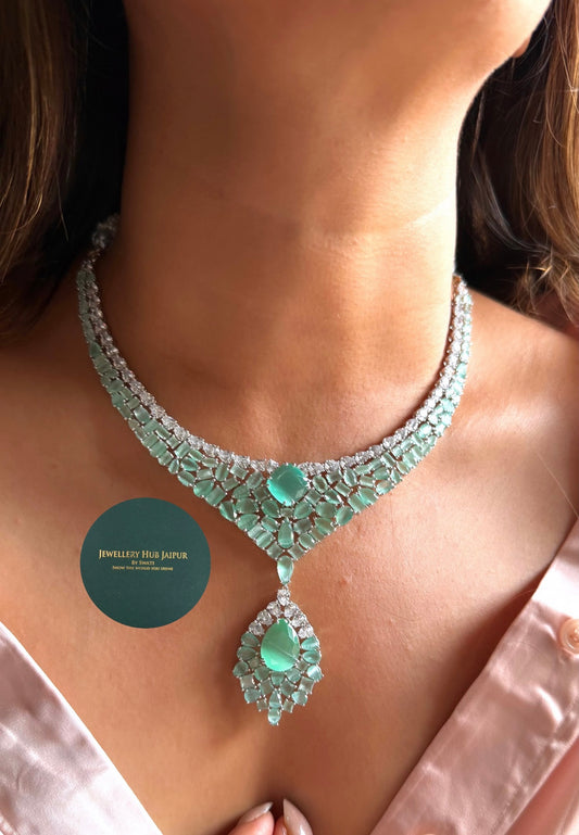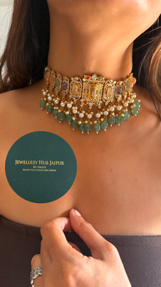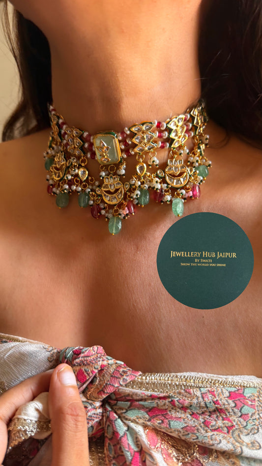 Mint inlay work with rani pjnk & emerald drops & emerald meenakari paachi choker set