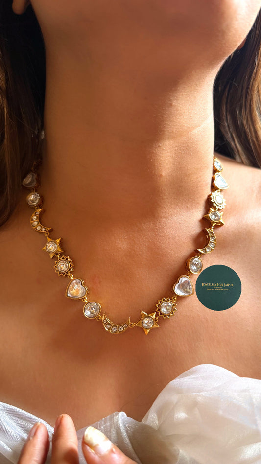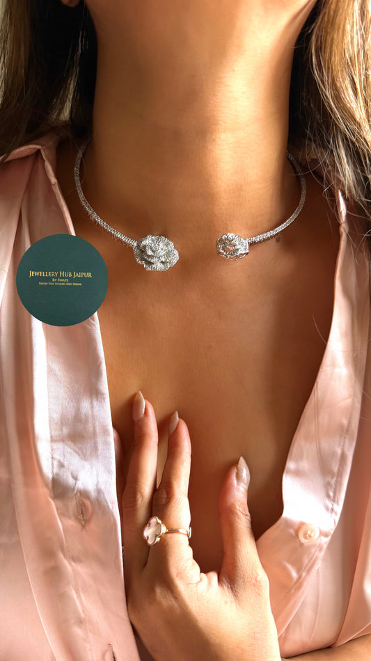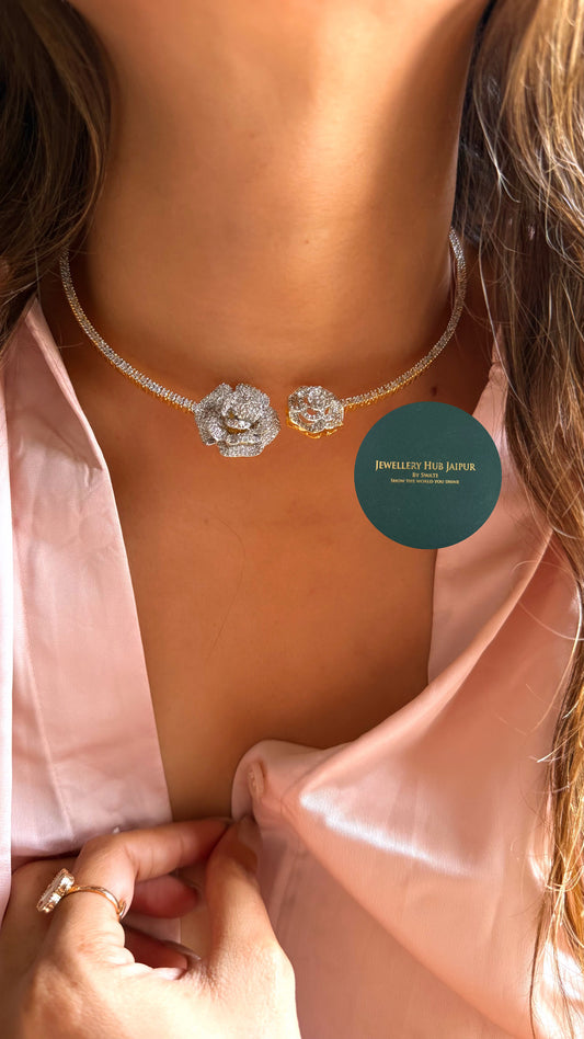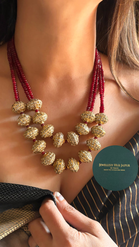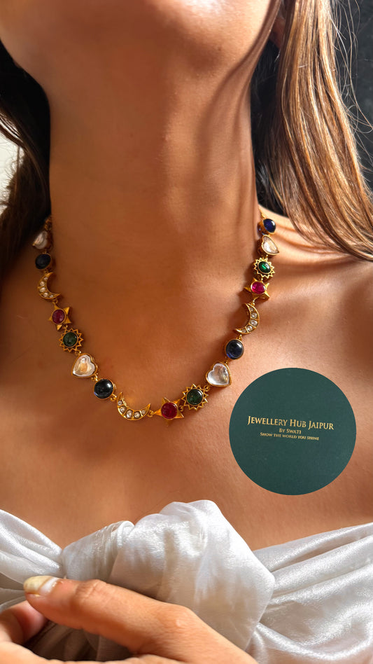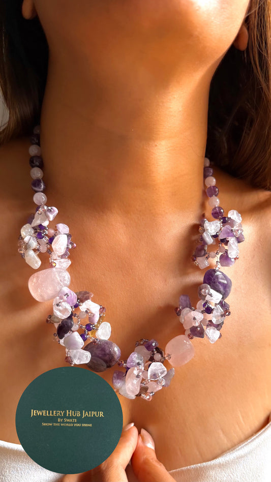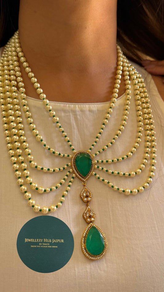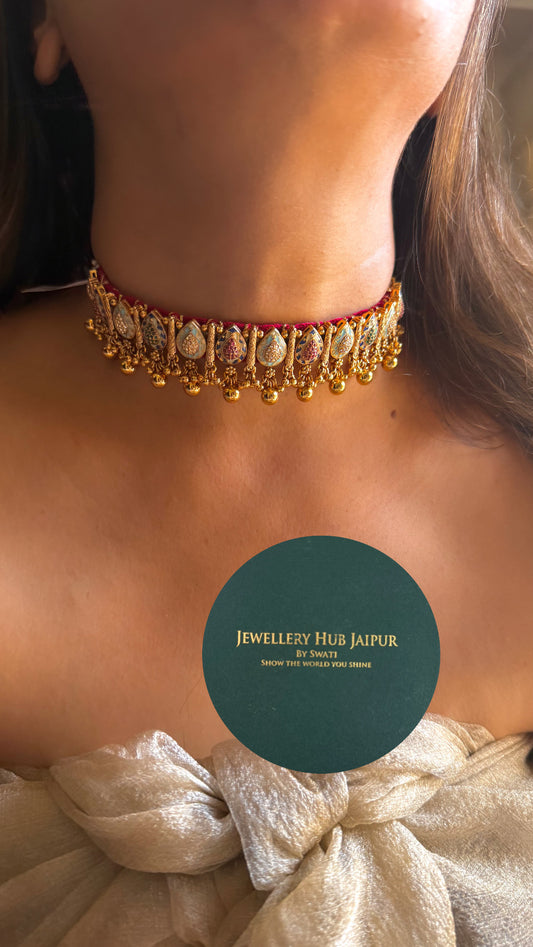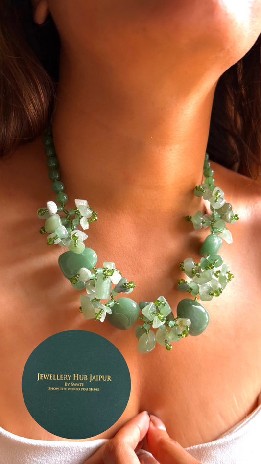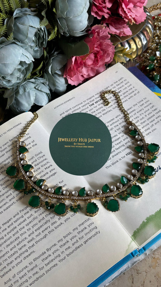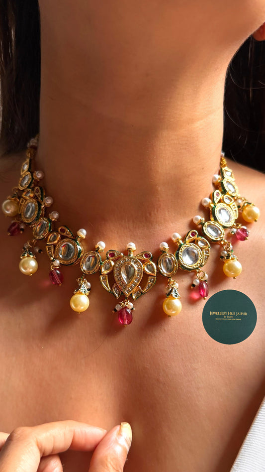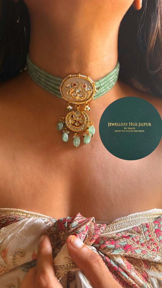 Rose quartz inlay work with mint drops & emerald meenakari paachi choker set