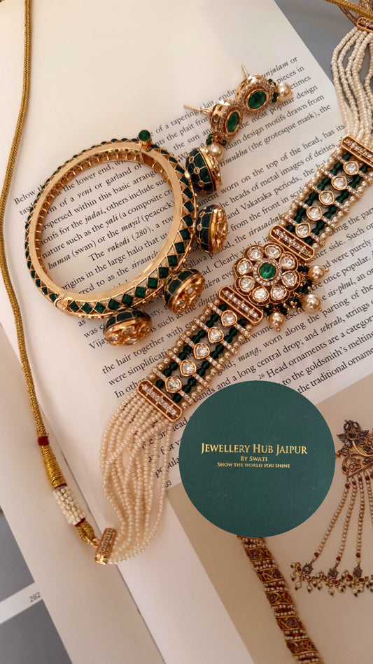 Goddess laxmi & emerald peacock design with mint temple choker set
