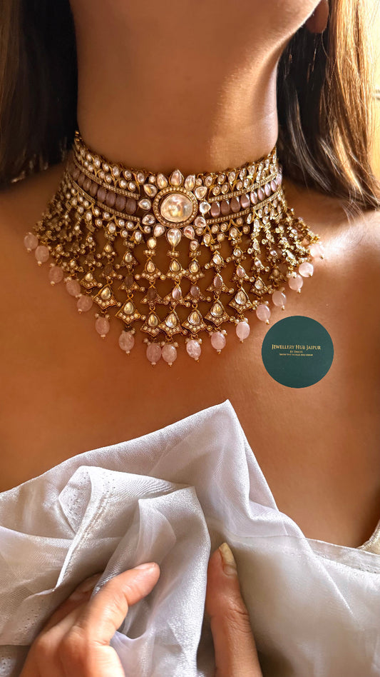 Meera- Rose quartz with sunflower designed moissanite polki & rose quartz drop choker set