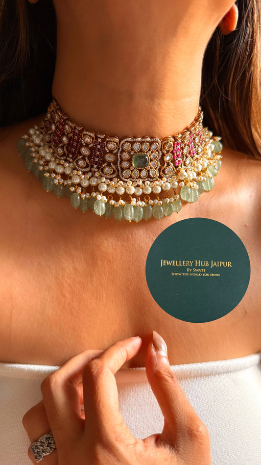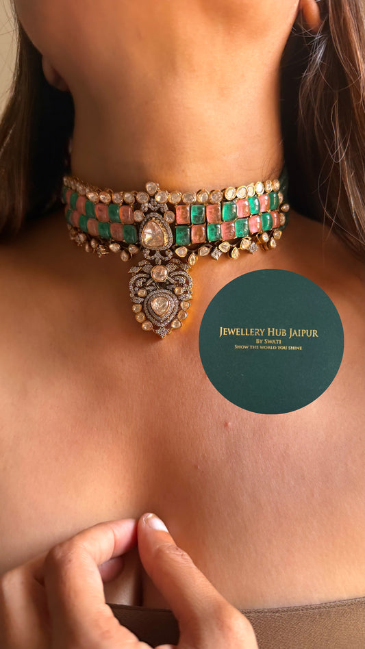 Real moissanite Rani pink with mint drop choker set