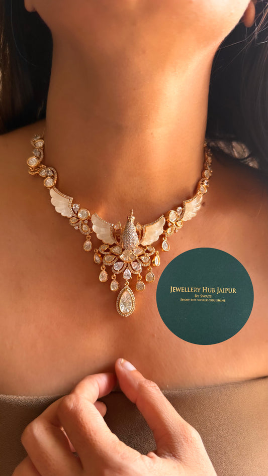 Moissanite peacock shaped design with feather design polki collar set