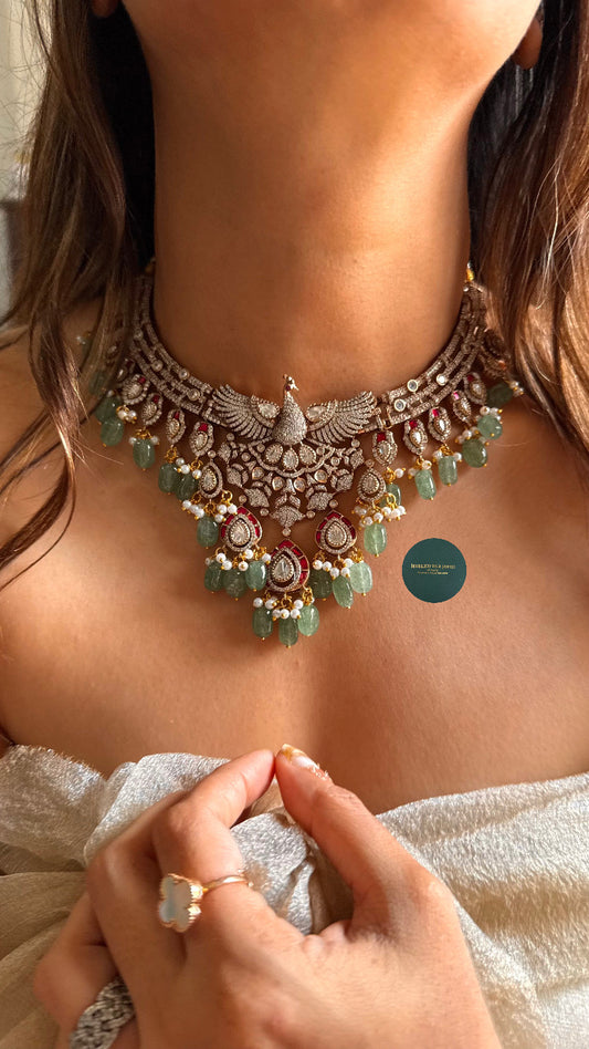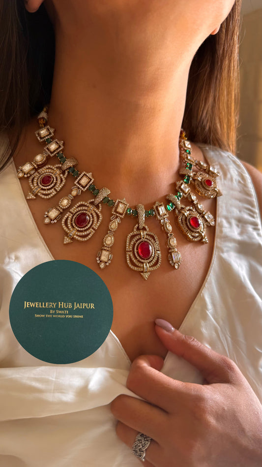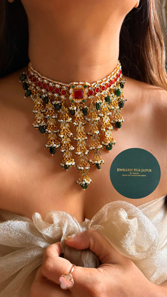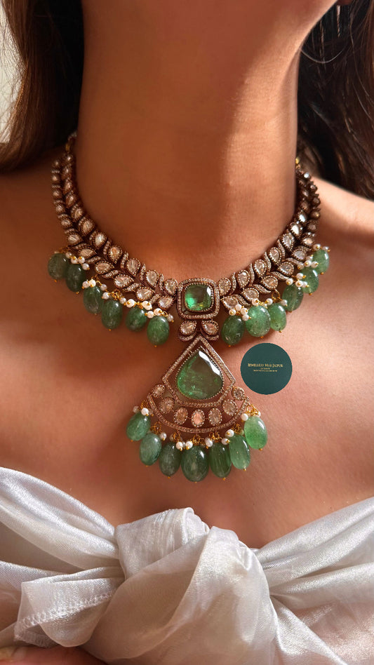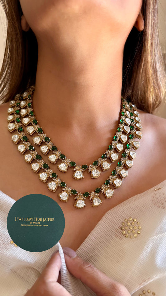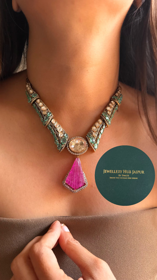 Amrapali inspired Natural stone Emerald & rani pink moissanite dual layer collar set