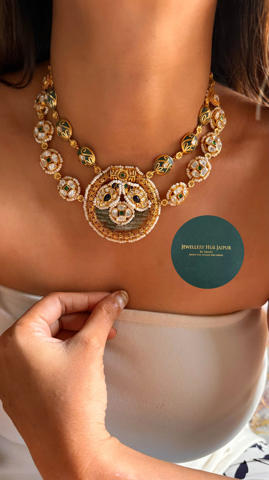Real moissanite Heritage sapphire & mint inlay with uncut polki double layer collar set