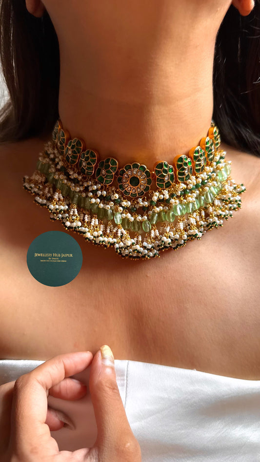 Emerald floral Kundan with mint & pearl drops heritage choker set