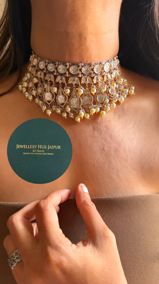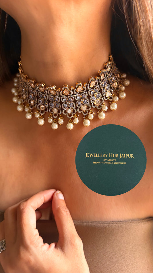 Real uncut moissanite polki & tanzanite Swarovski set with pearl drop choker set