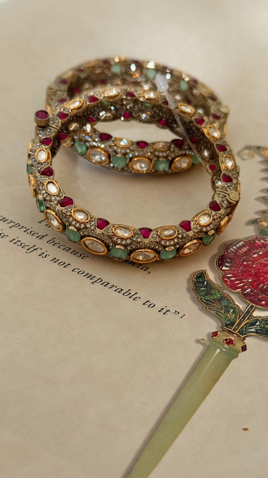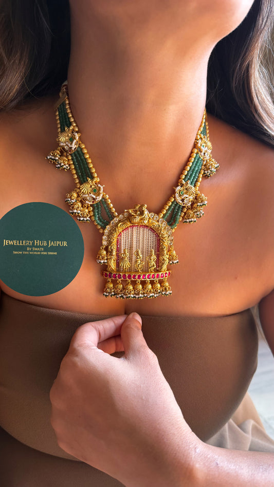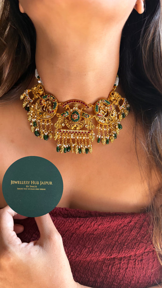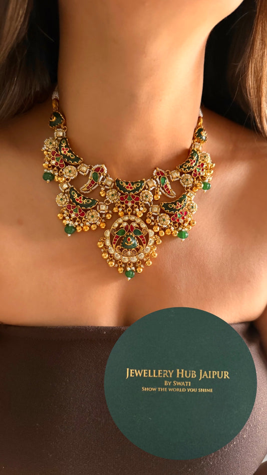 Real Moissanite Rajwada peacock emerald mix polki necklace