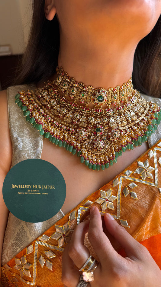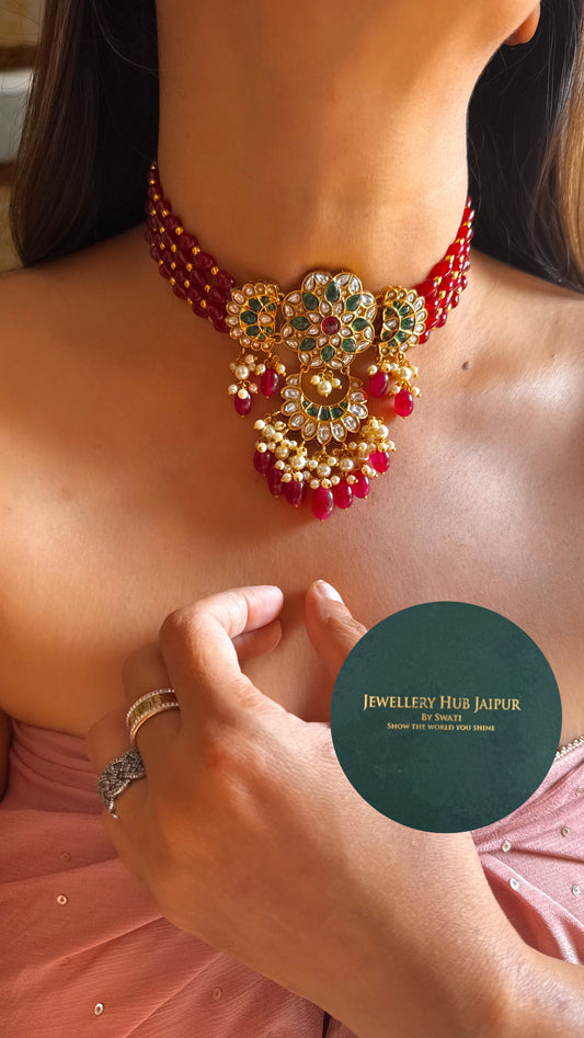 Real Moissanite statement Emerald & Rani pink katdana work choker