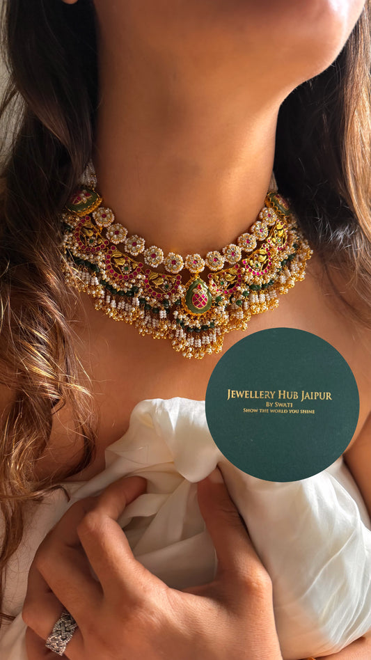 Heritage Rani pink & emerald moissanite with pearl drop rajwada choker set
