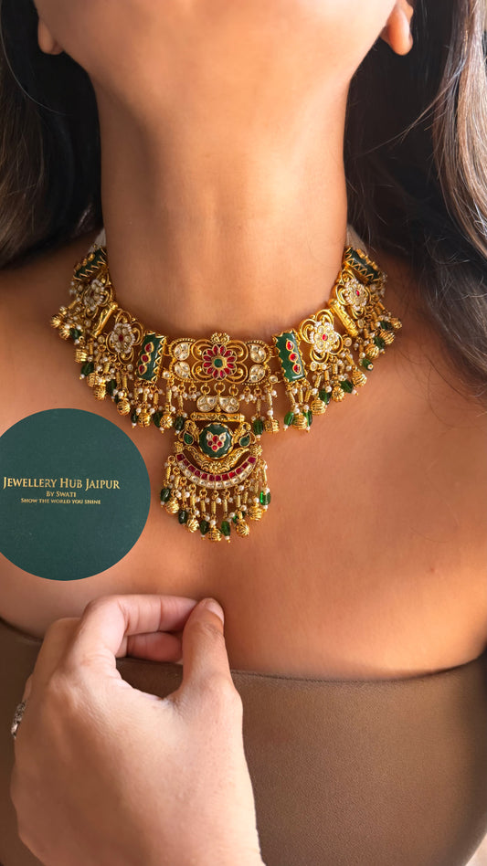 Heritage Emerald inlay work & rani pink floral royal heritage rajwada choker set