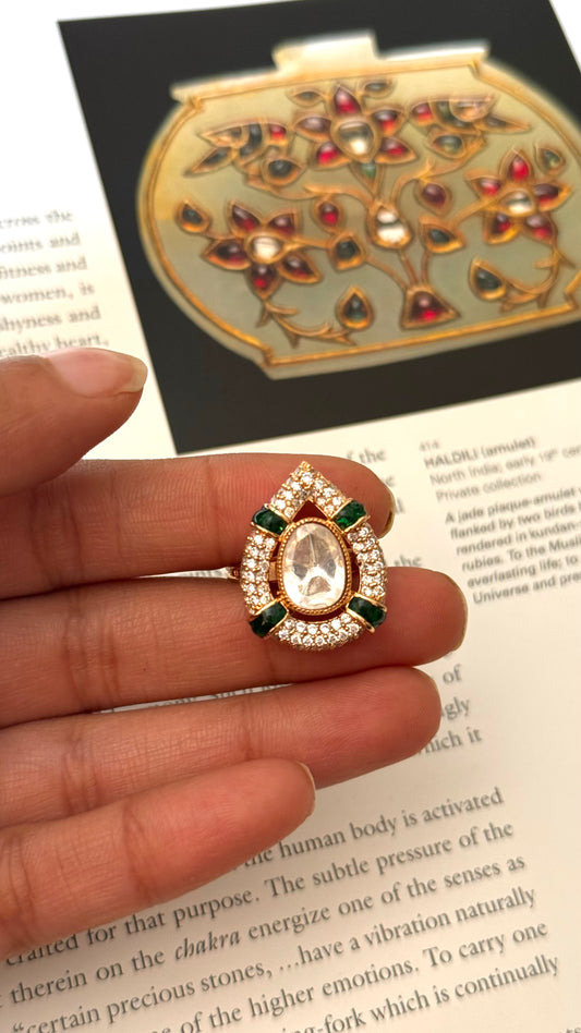 Ring kundan drop shape emerald adjustable