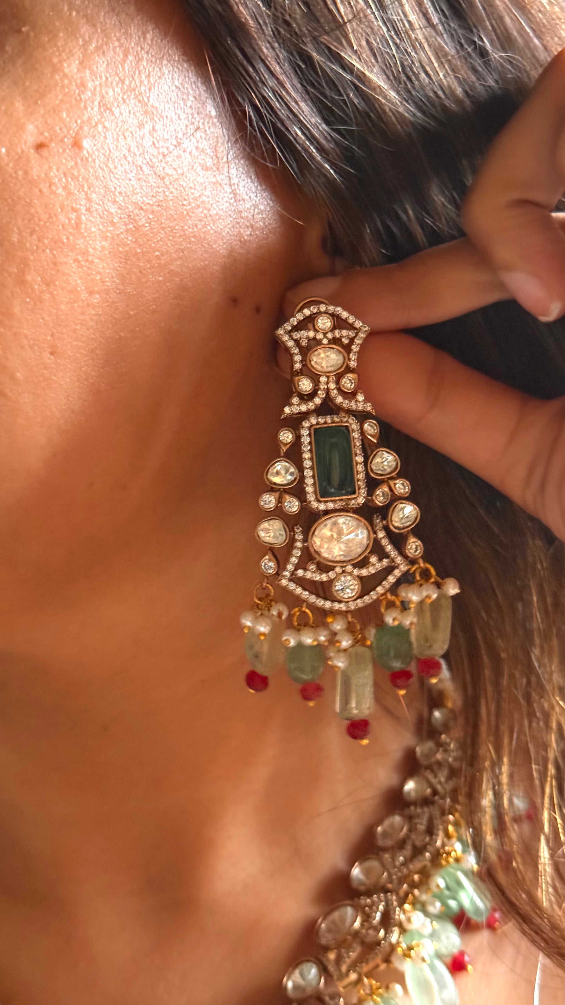 Emerald doublet moissanite polki with mint drop collar set