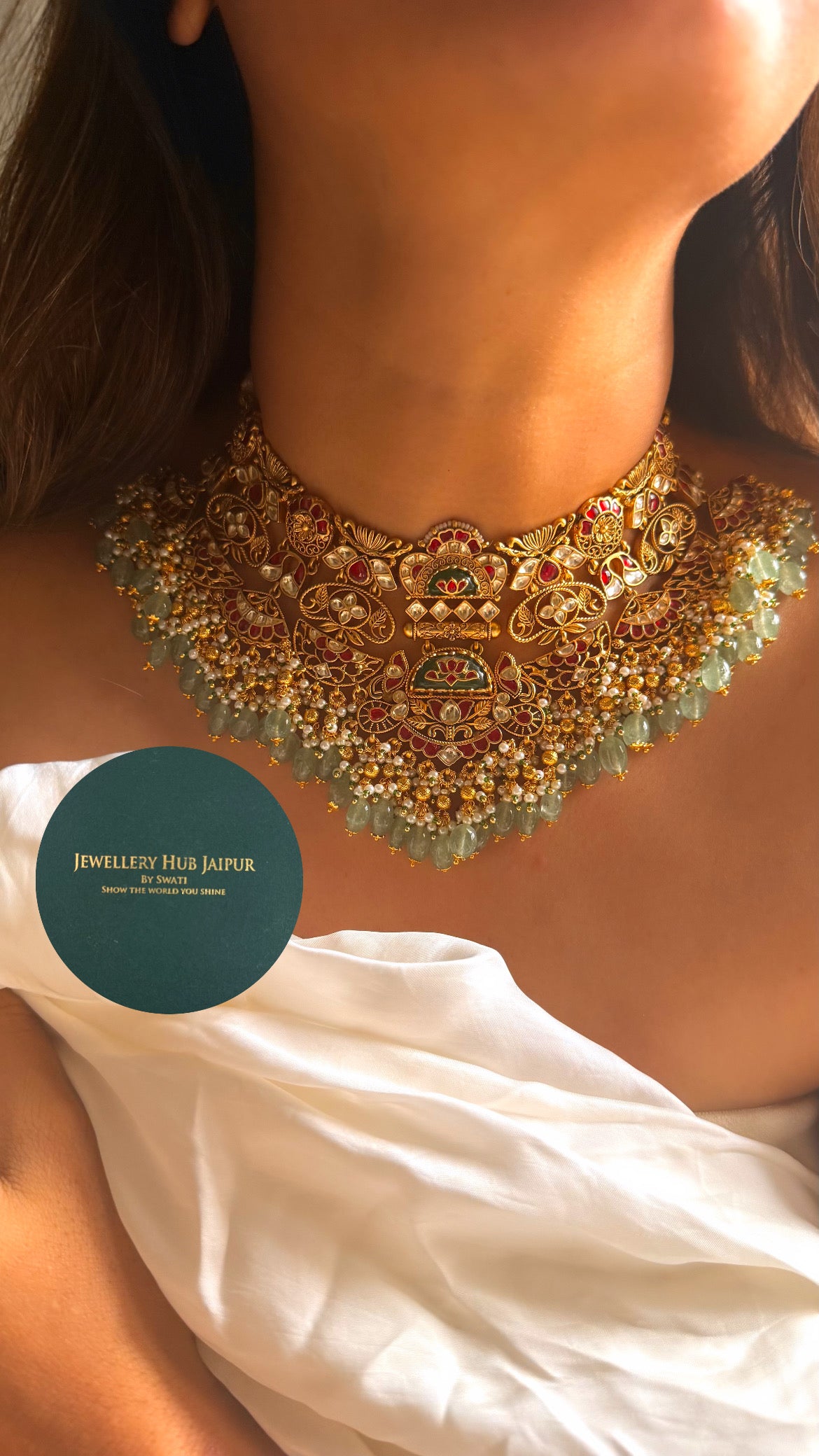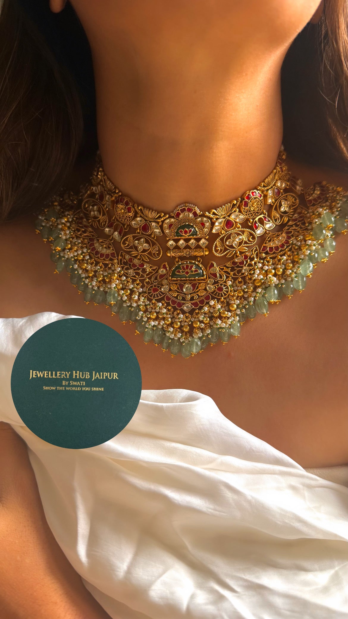 Handmade Heritage Polki Emerald inlay work & rani pink heritage rajwada bridal set