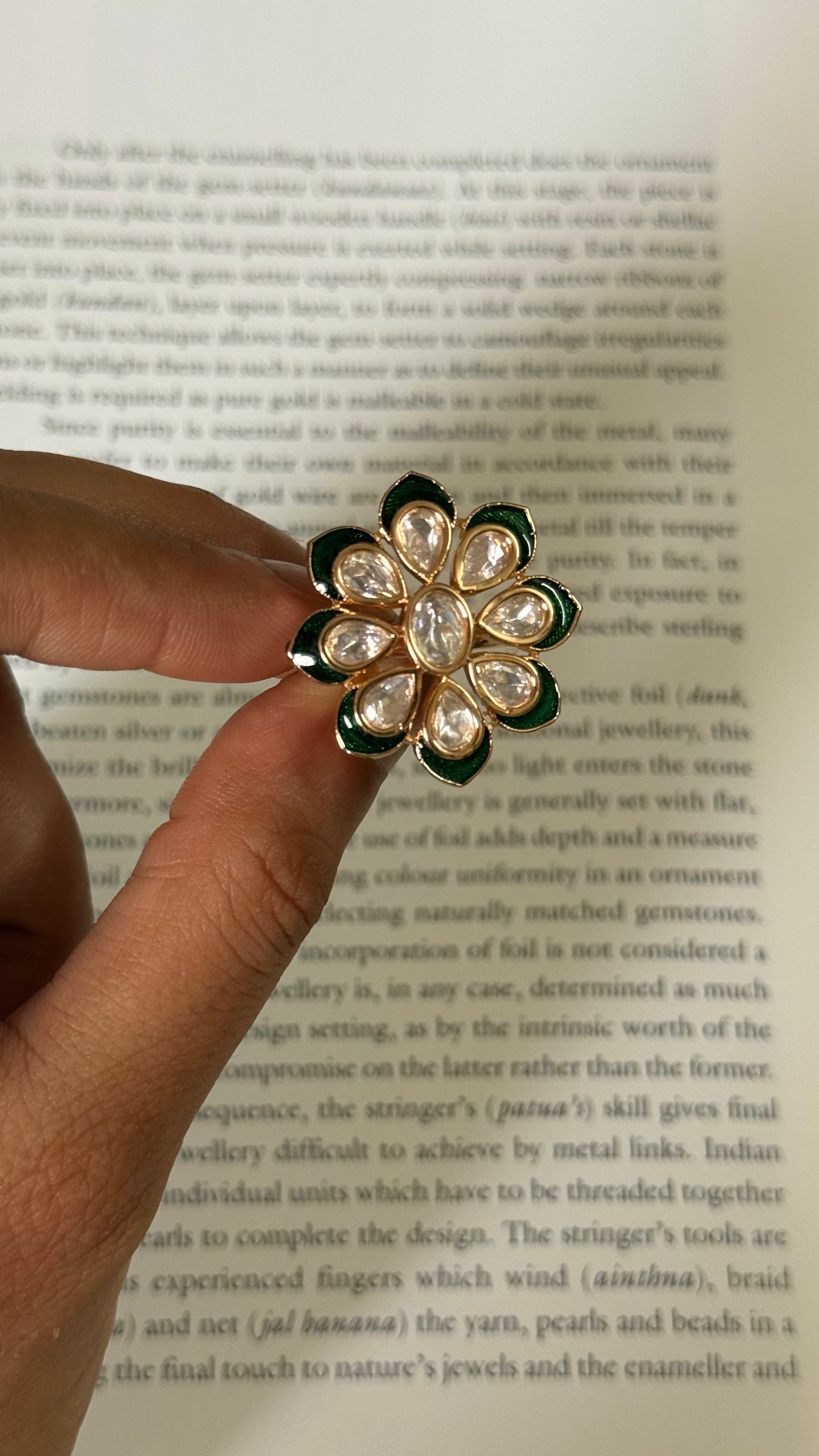 Emerald meenakari moissanite floral adjustable ring