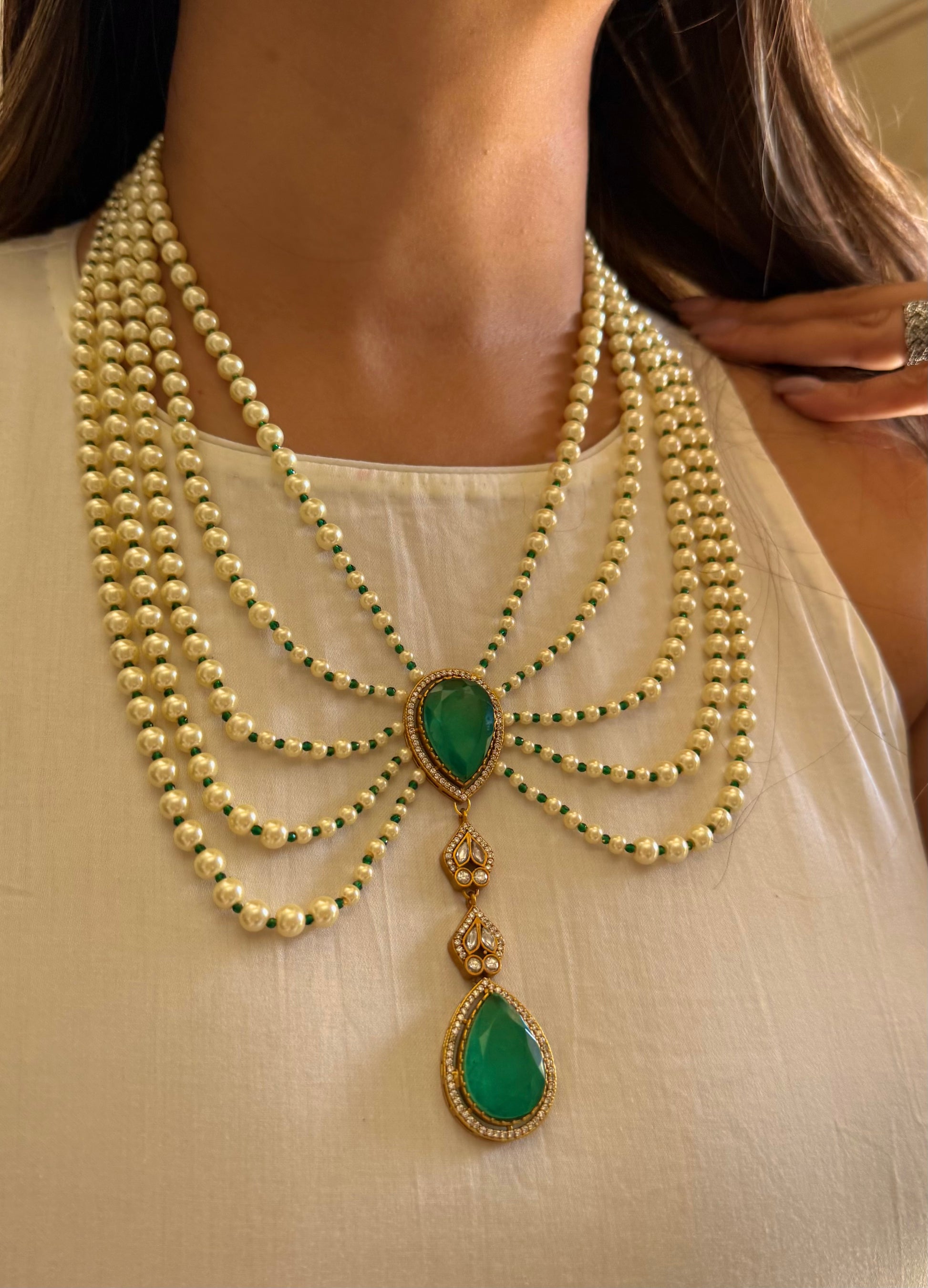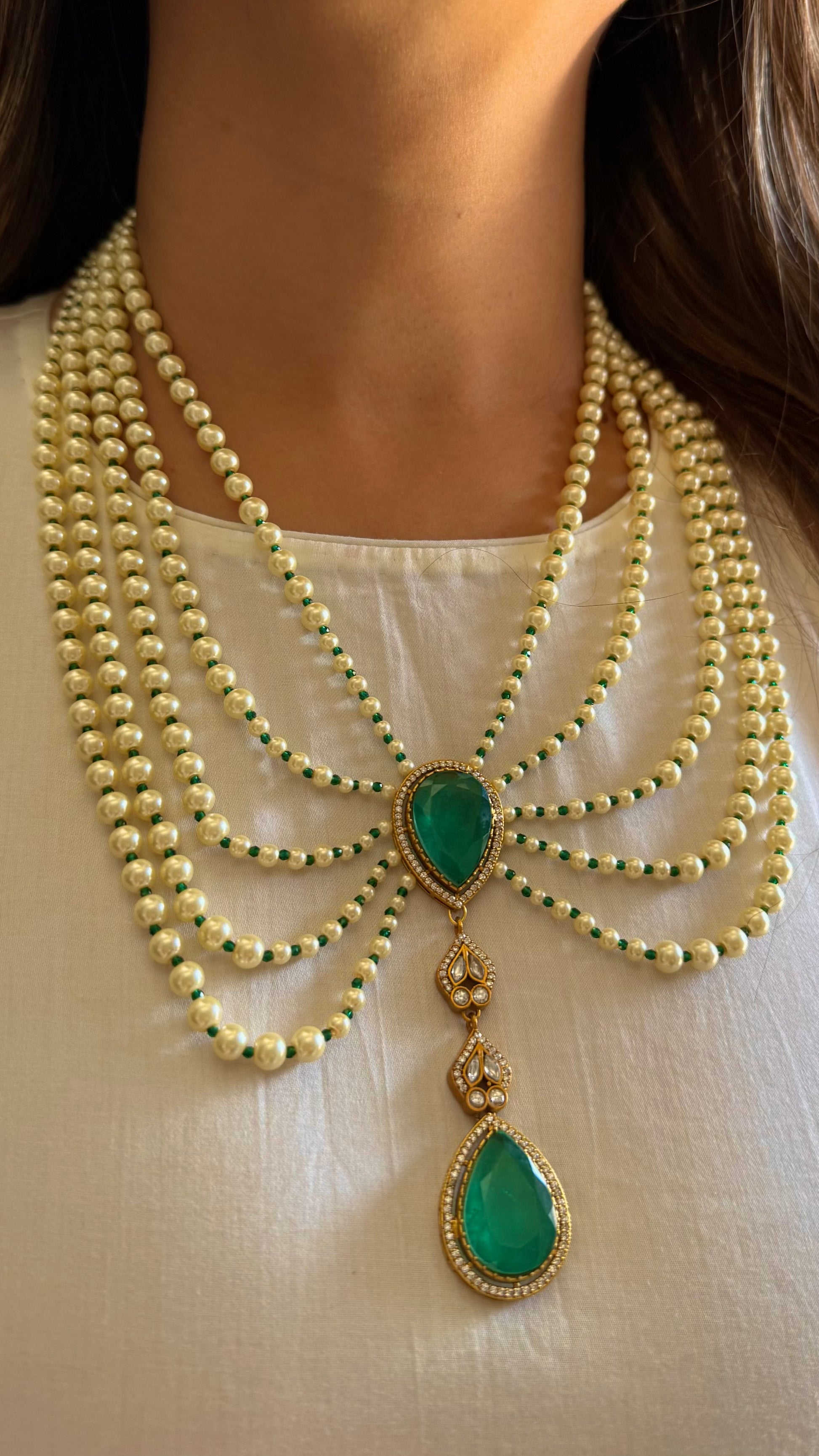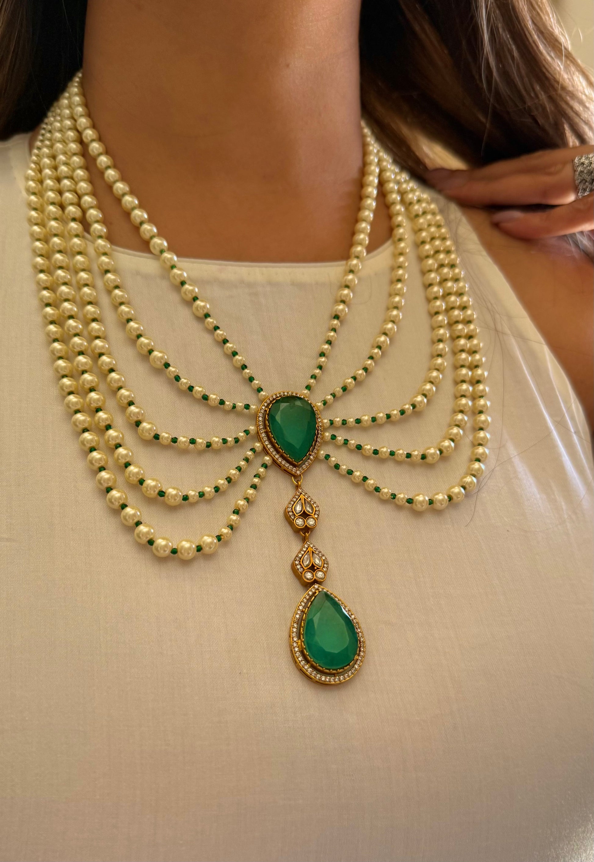 Iqra Emerald moissanite designer mid length pearl necklace