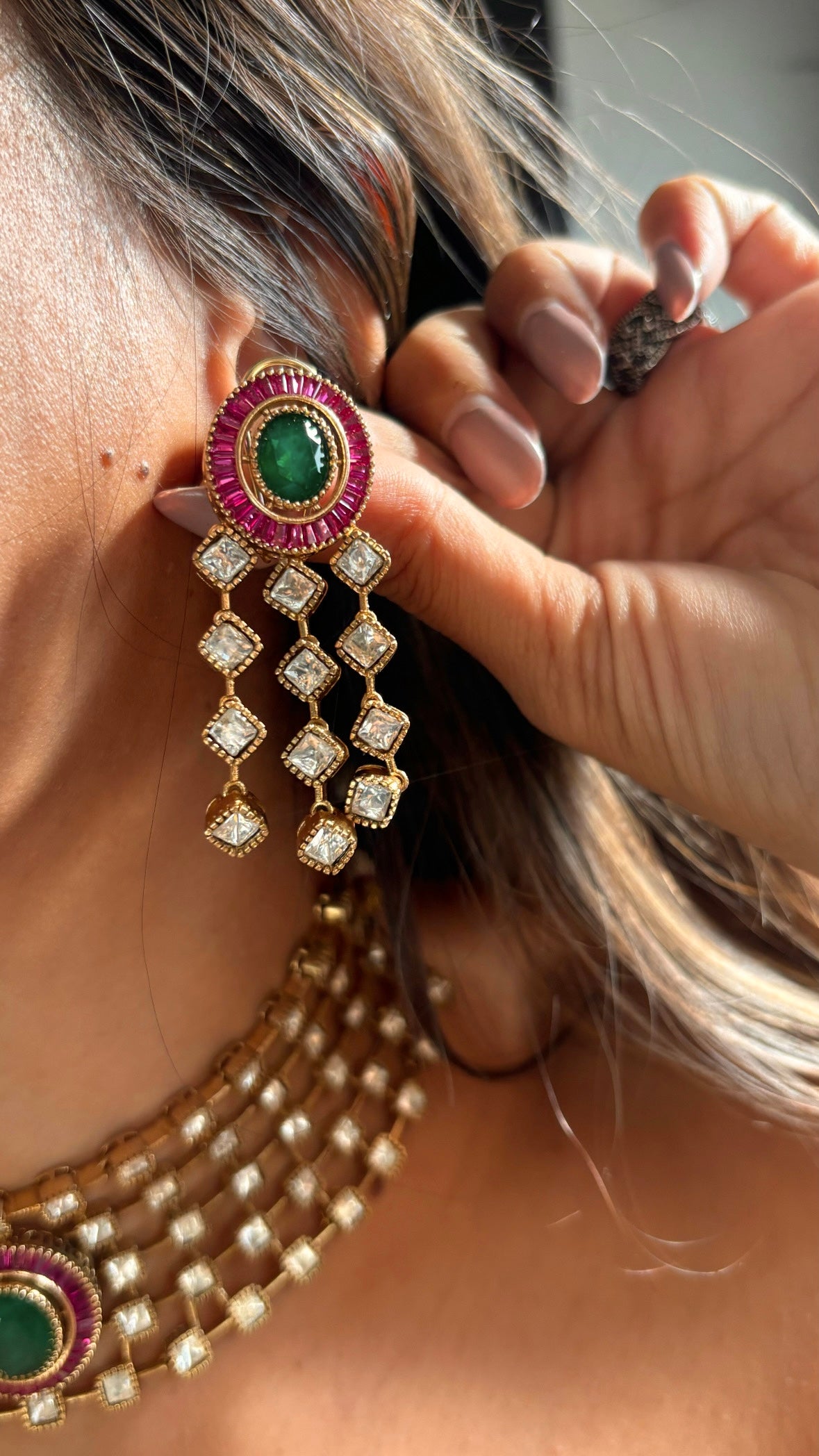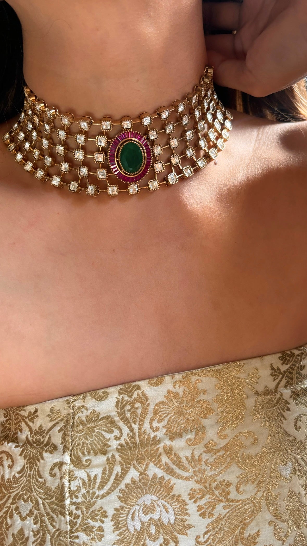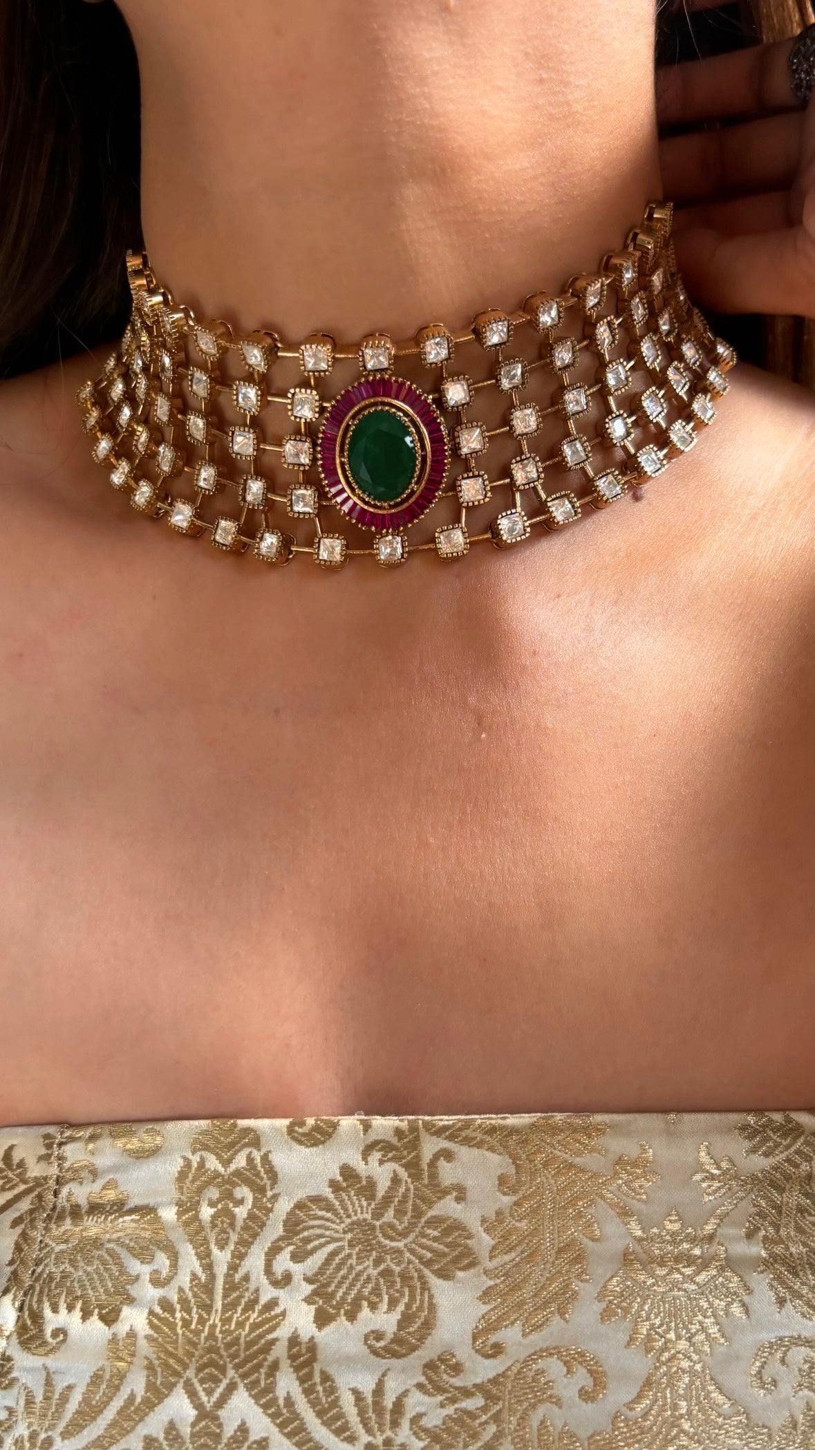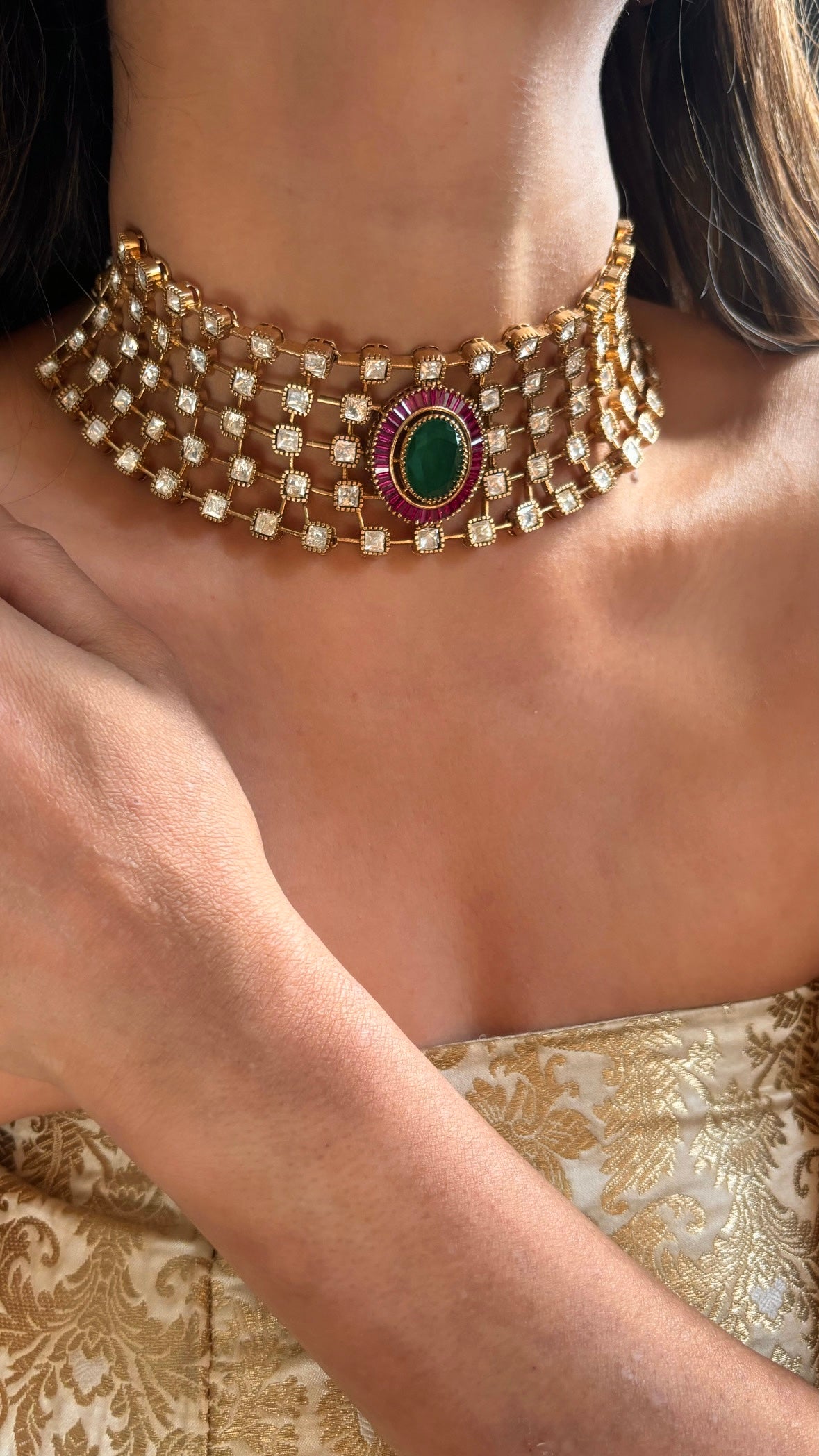 Bridal Asia inspired Moissanite ruby & Emerald choker necklace set