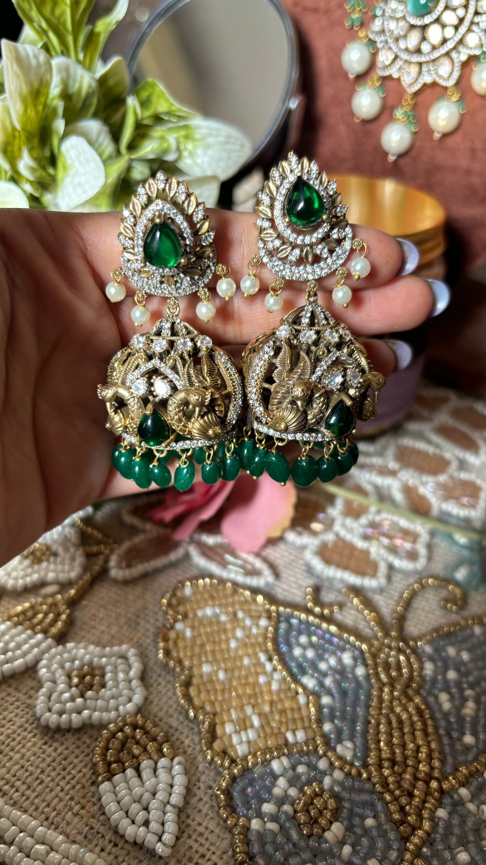 Emerald victorian peacock inspired designer Jhumka