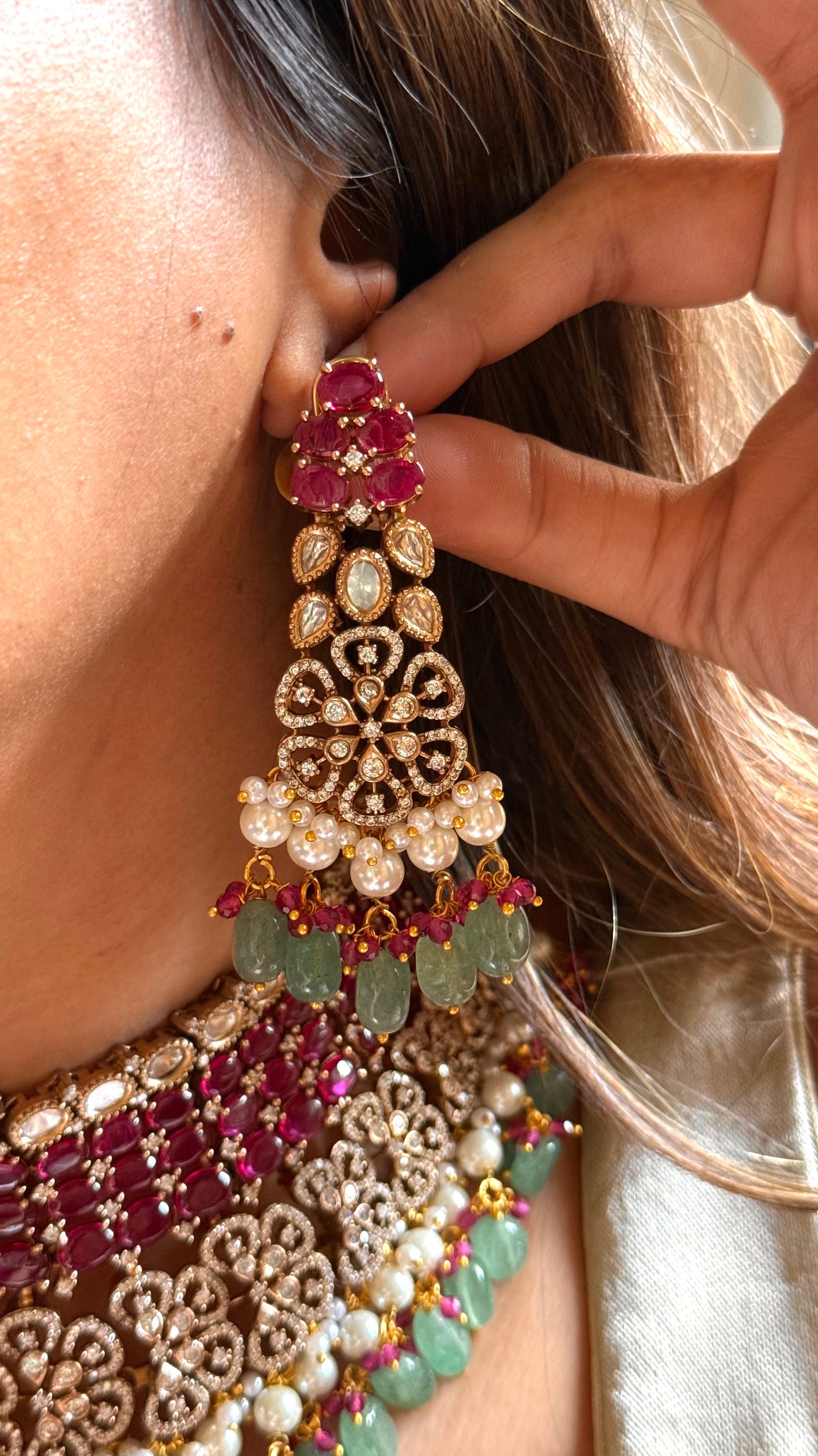 Rani pink doublet moissanite polki with pearl & mint drop choker set