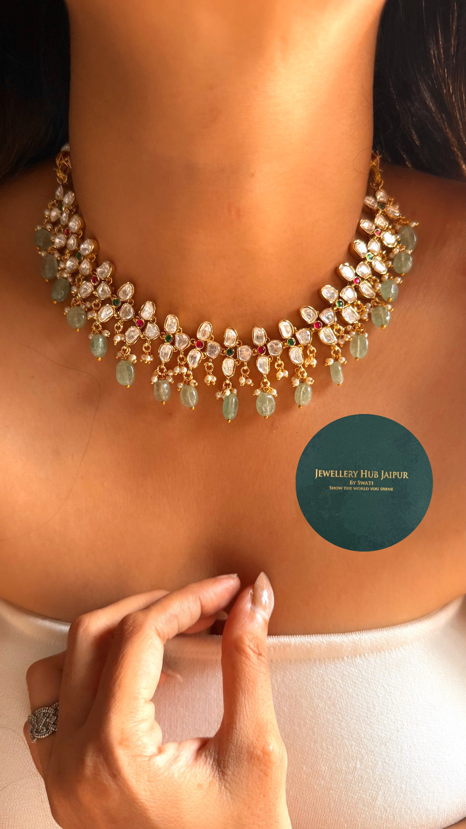 Real Moissanite Rani pink & emerald Moissanite polki floral set