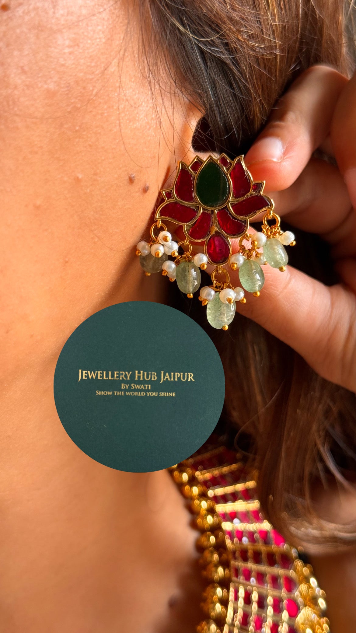 Real Kemp Rani pink & emerald paachi rajwada with mint drop collar set