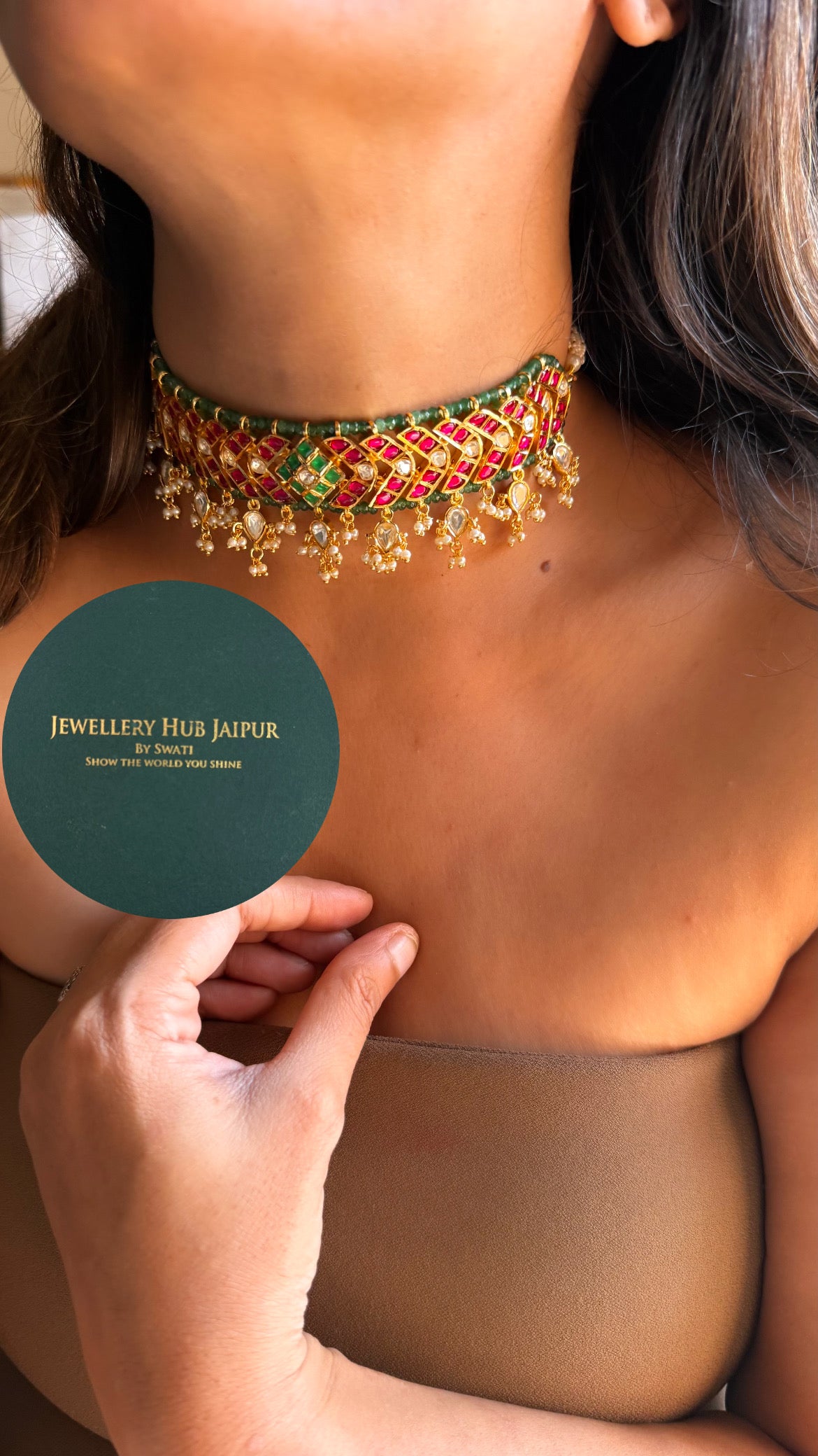 Heritage Rani pink & emerald real moissanite designer choker set