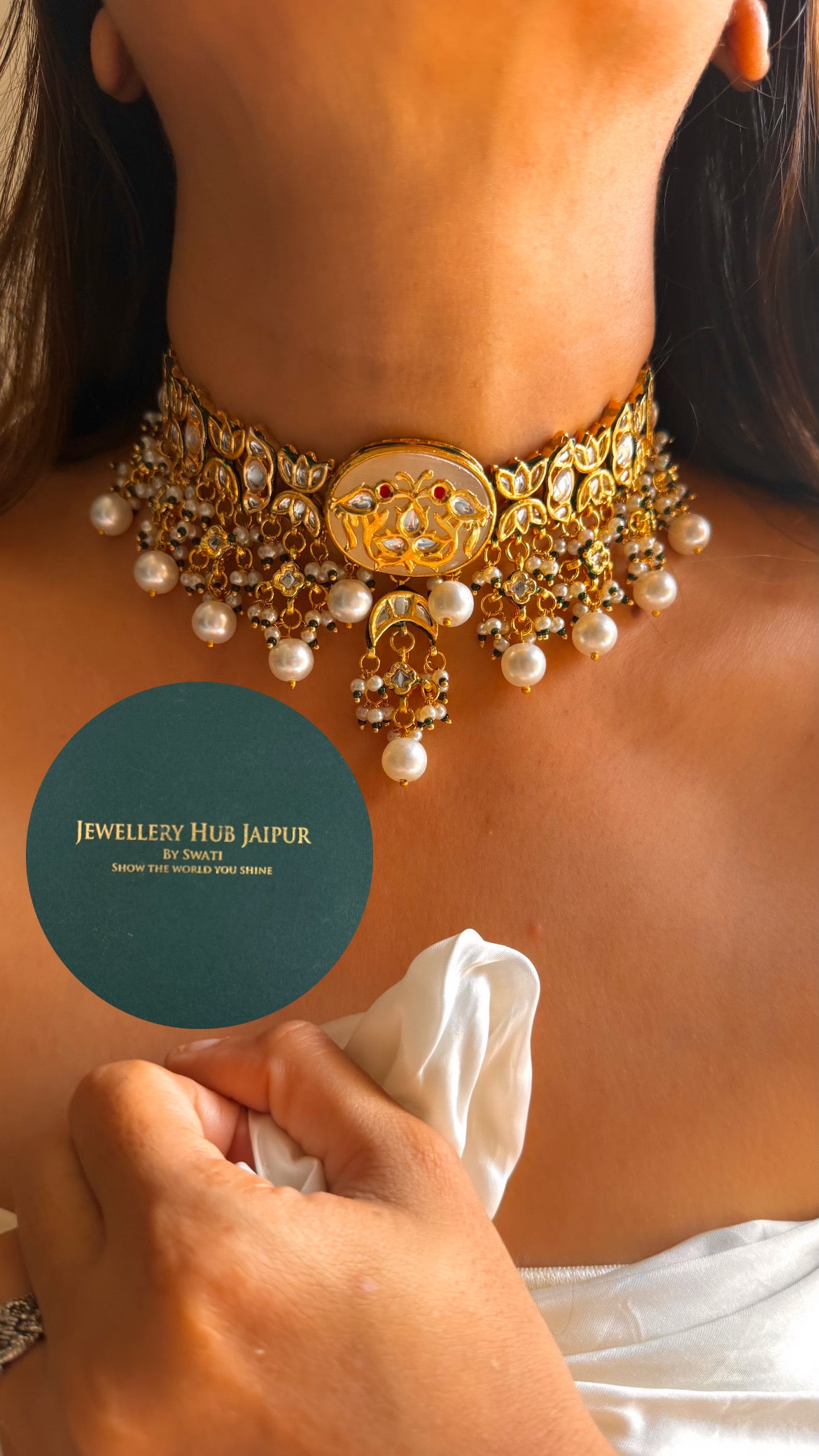 Rani pink inlay work & emerald meenakari paachi with pearl drop choker set