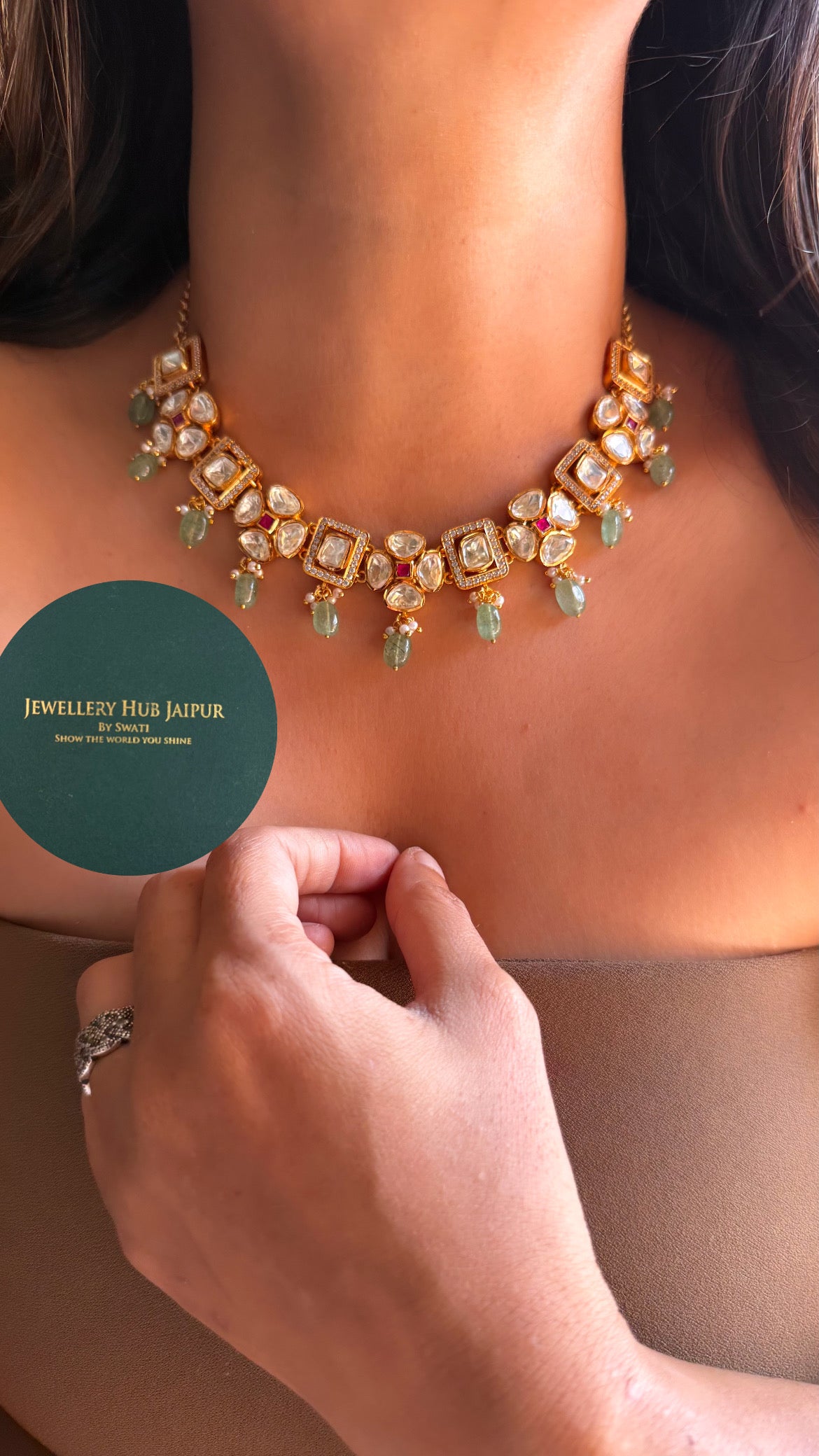 Real moissanite rani pink & emerald floral with mint drop collar set