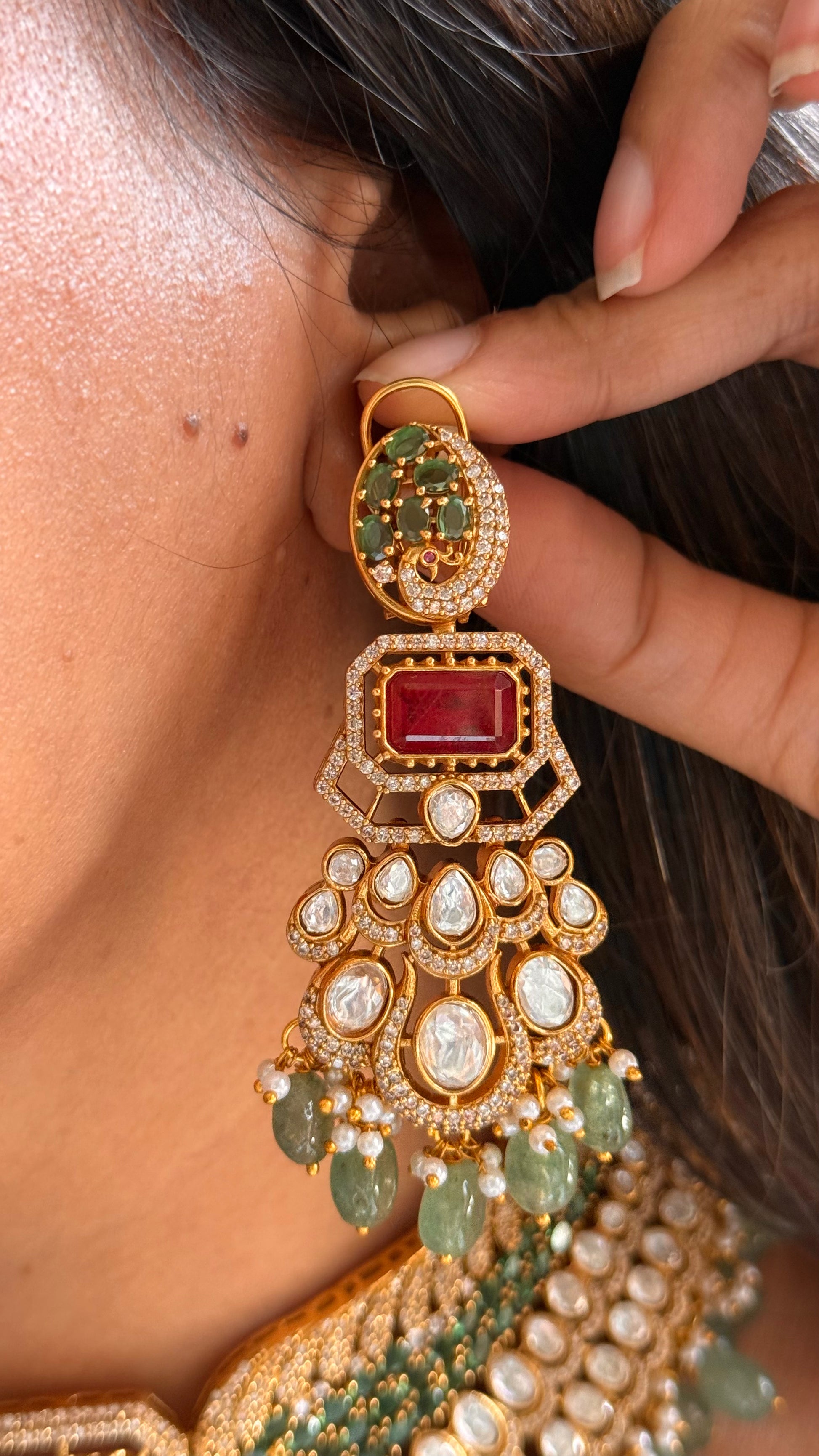 Ruby & mint drops with peacock design choker set